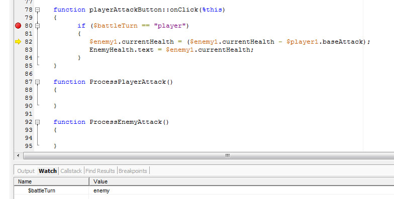When I debug, the if statement in playerAttackButton processes the statement even if $battleTurn is not equal to "player." Here's a screen shot showing the code currently past the if statement when the Watch shows the variable is set to "enemy." eluminarts.com/images/tgb/tgb1.jpg