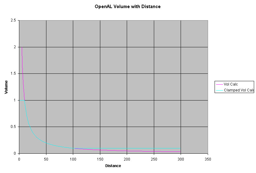 Volume=(Volume*ListenerGain );This code is from the aluCalculateSourceParameters() function in openal/win/Alu/ALu.c (I haven't checked the other platforms for differences). It's a fairly straightforward formula, but I just can't visualize what's occurring. So, time to model it in Excel...I've made some charts so you may also follow along. All of the charts show how the sound's volume changes with distance. They each have a MinDist of 10 units and a MaxDist of 100 units. The first chart shows the volume changes from 1 to 300 units, using both unclamped (AL_INVERSE_DISTANCE) and clamped (AL_INVERSE_DISTANCE_CLAMPED) distance models, with a rolloff of 1.0 (the default that Torque uses):