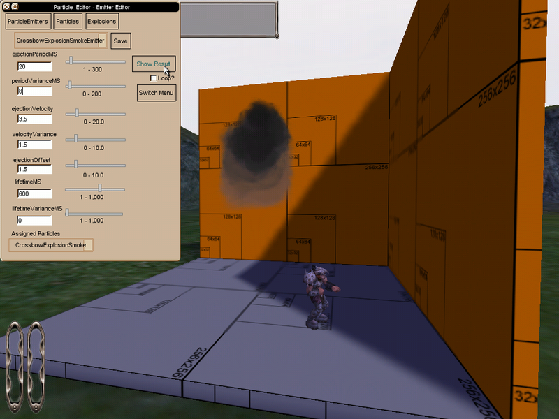 Well, I do enjoy a good tease :D I'm designing it to use a custom map (well it can use any map, as long as the position "100 100 105" is free) because I couldn't stand the old Particle Editor popping them up right in front of your face. Half of the particles wouldn't be visible, and you had no good impression on the emitter's size. There are still a few bugs I have to work out, but I'll have the next few days for those.Editting emitters, CrossbowExplosionSmokeEmitter