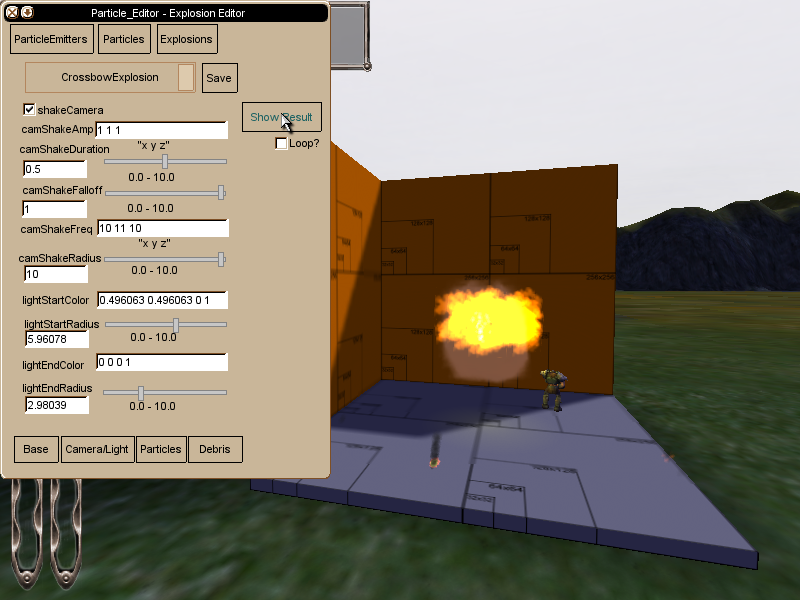 Explosion Editor editting the CrossbowExplosion. Full debris, light, and sounds (well the sound only appears about 1/2 the time. But I think that is my computer)