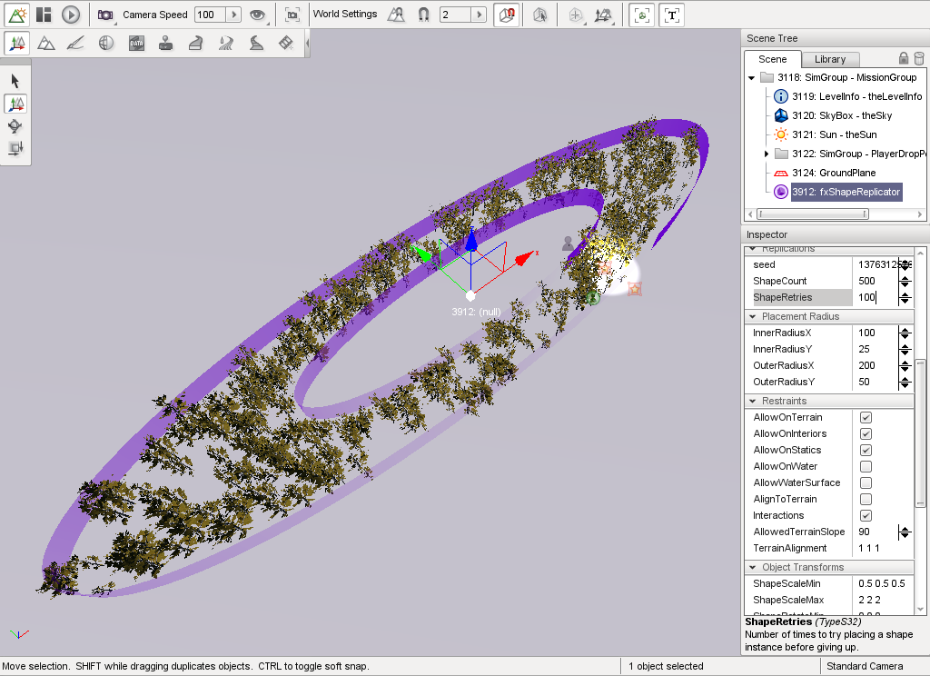 We created a FX Shape replicator and assigned one tree model to it,we set the bounds of the replicator to 100 x 50 so its oval